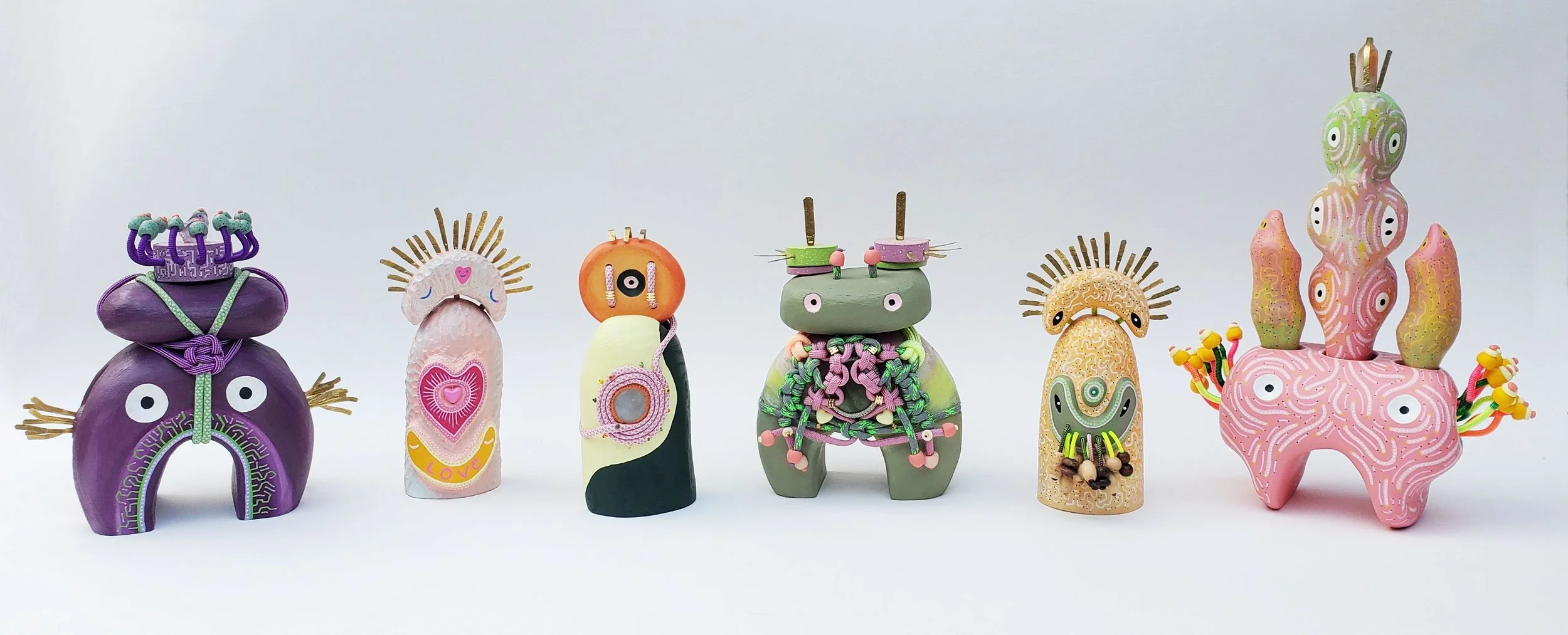Through her work, she explores the dialogue between materials: carved wood, gemstones, clay, beads, and ropes intertwine in vibrant compositions, each element imbued with its own energy.